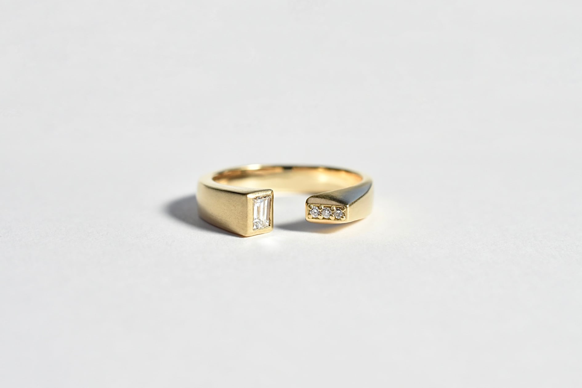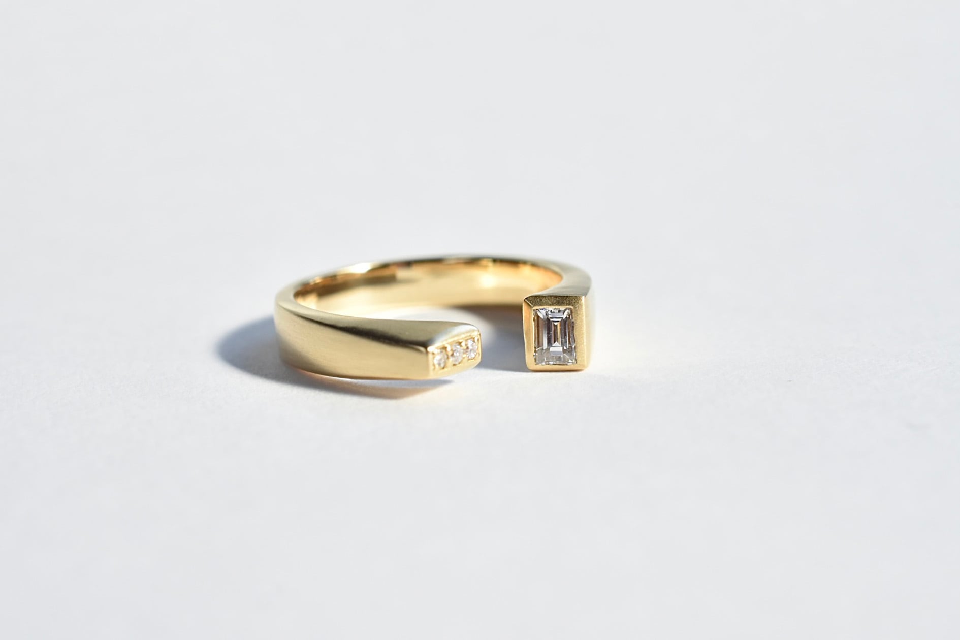 重厚感のあるエッジの効いたで個性的なフレームとバゲットカットダイヤモンドのシャープな輝きが相まってとても雰囲気の良いリングに仕上がりました。