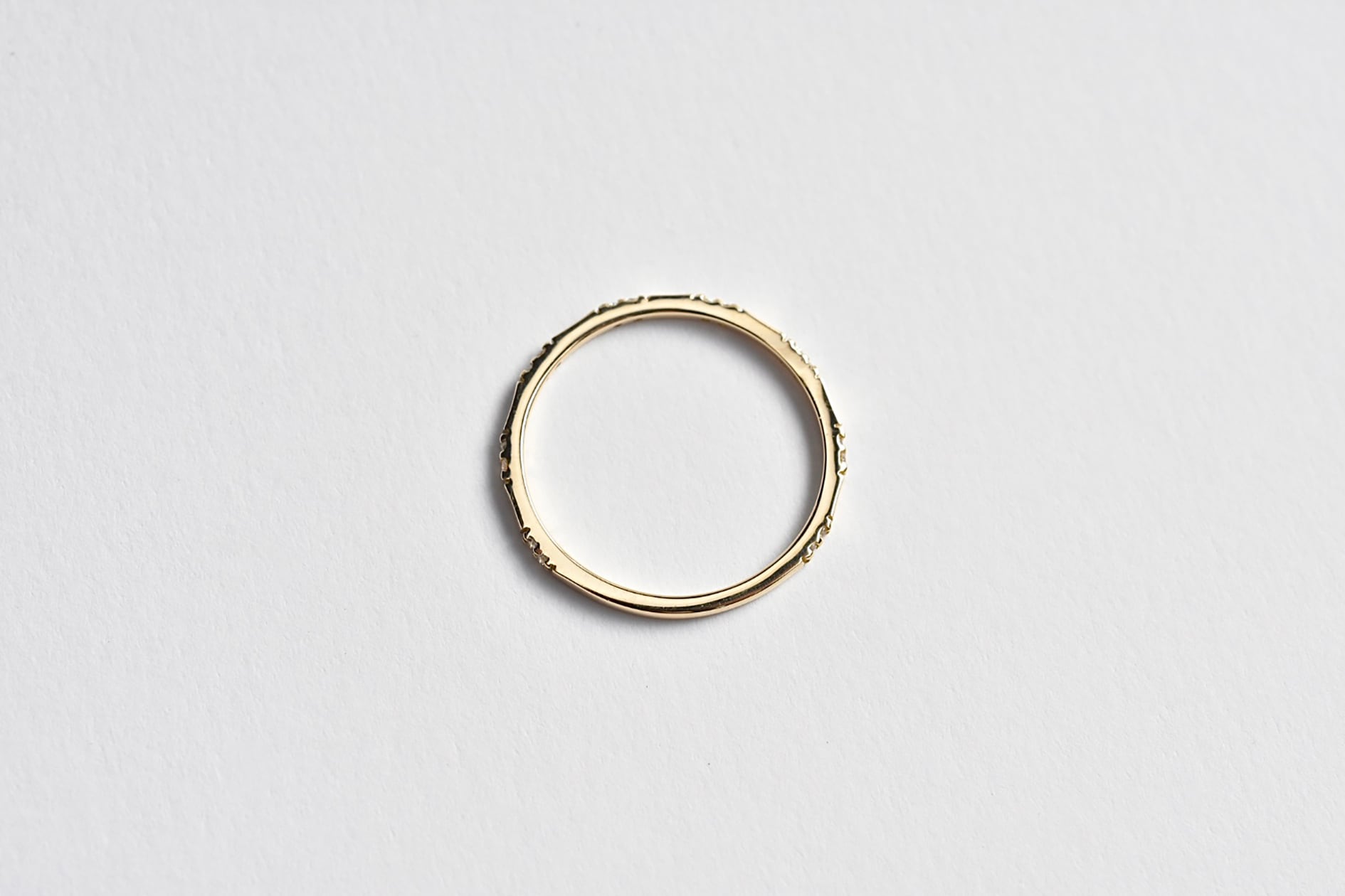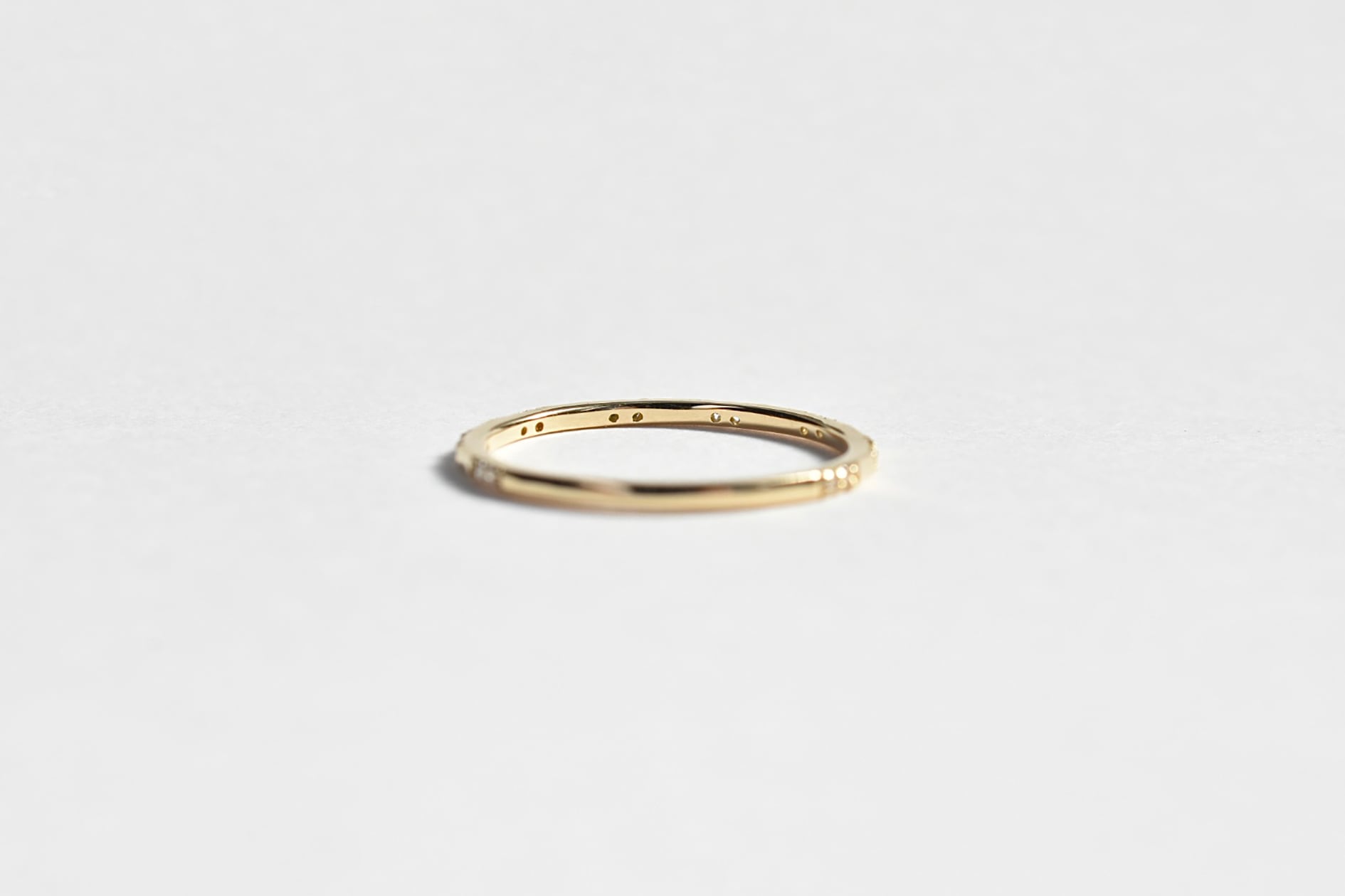 連なったダイヤモンドと均等に空間のあるデザインが個性的なリング。