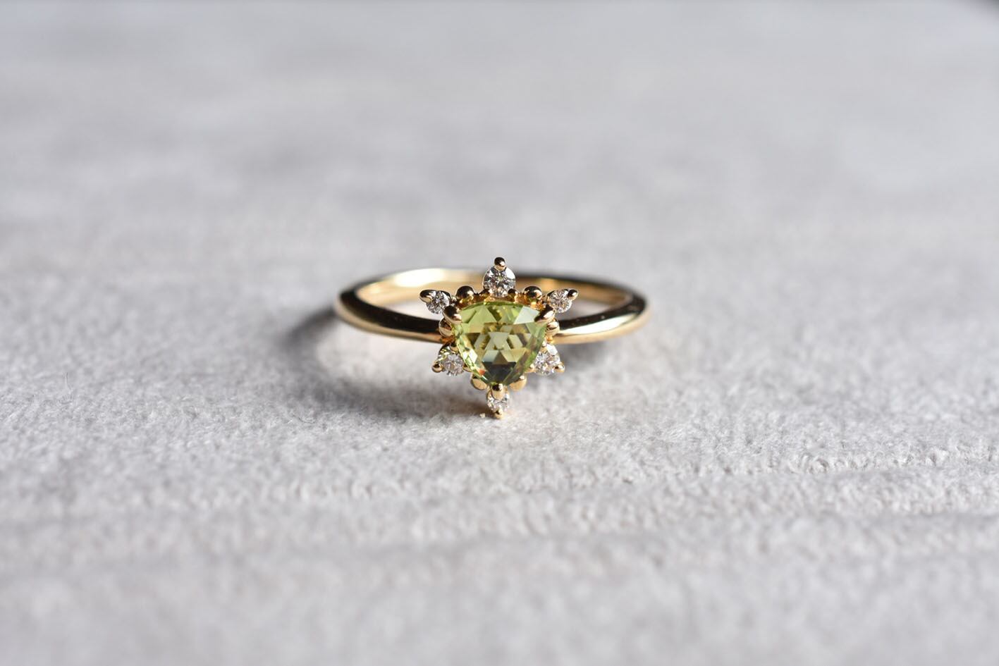 8月の誕生石としてもポピュラーな宝石になりますがトリリアント型のローズカットと珍しい形状は一般的なペリドットに比べ一味も二味も違う輝きをお楽しみいただけます。