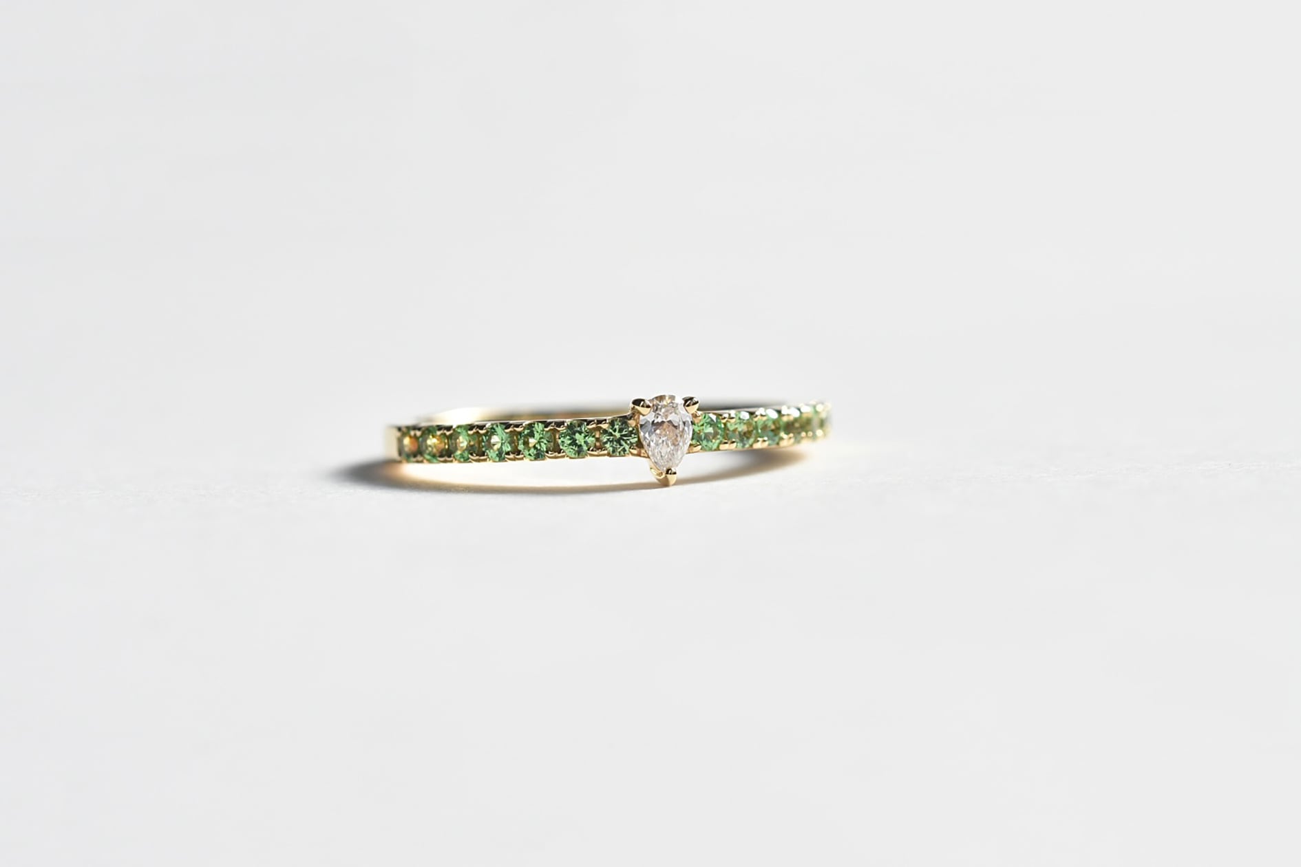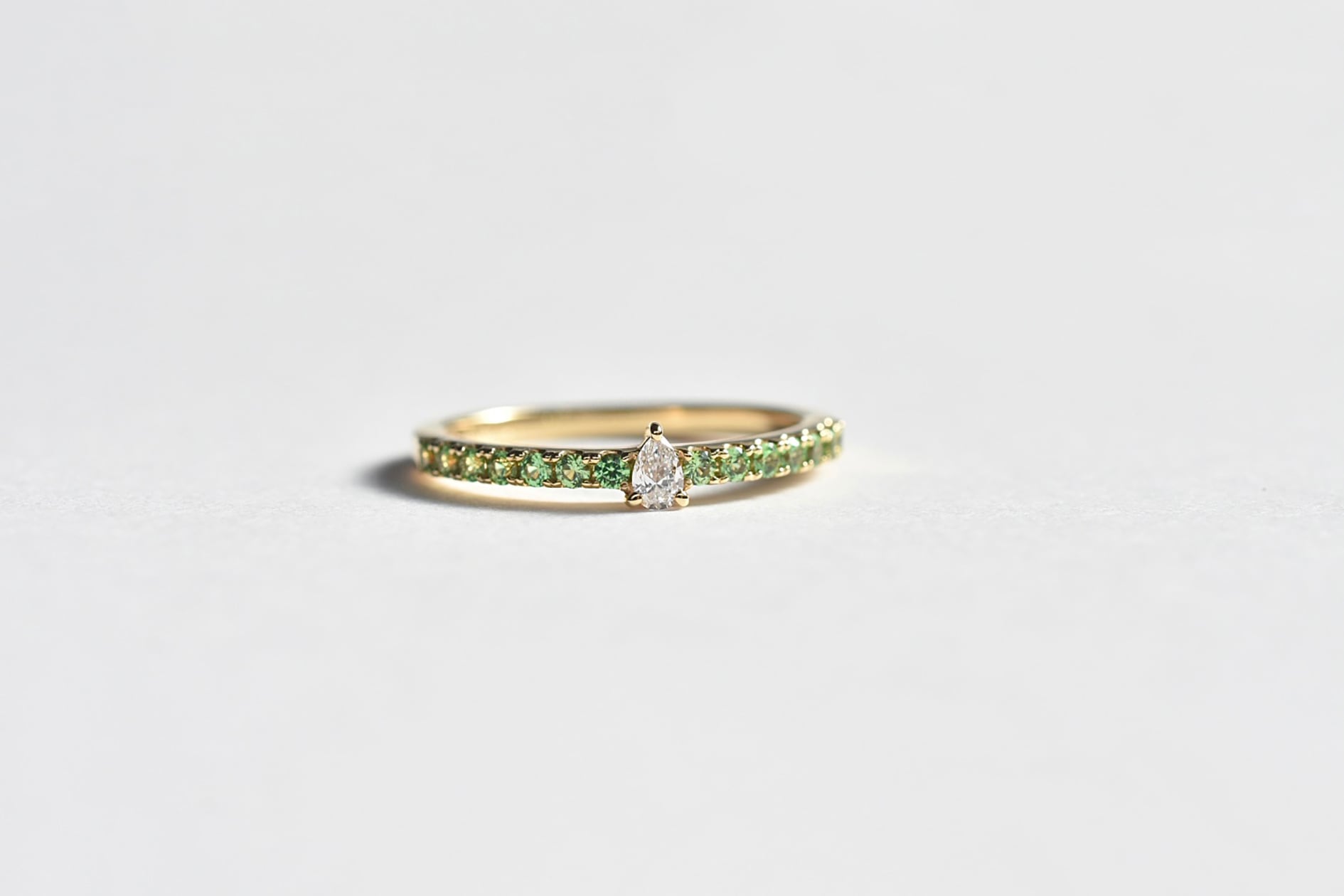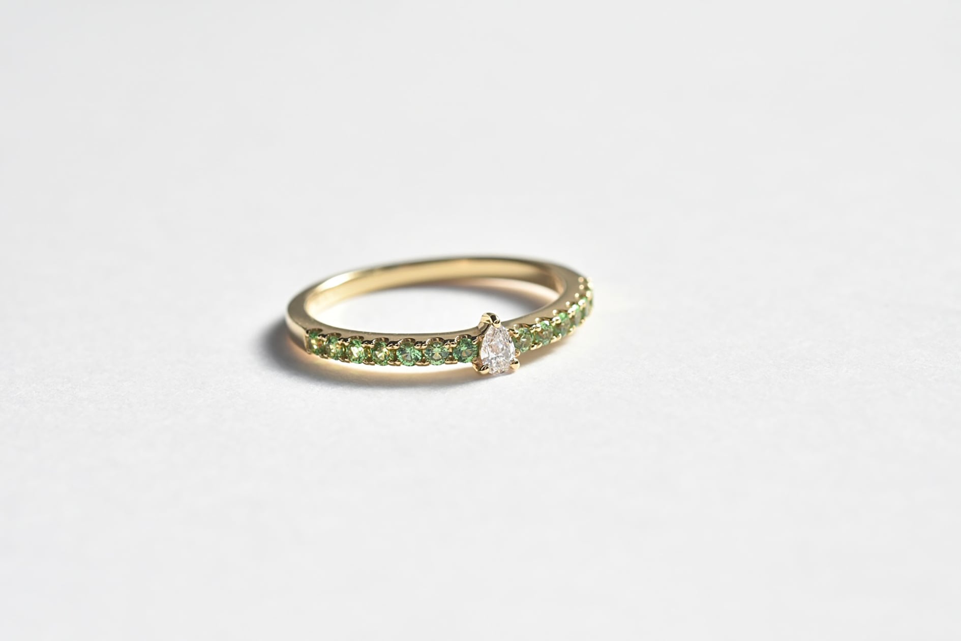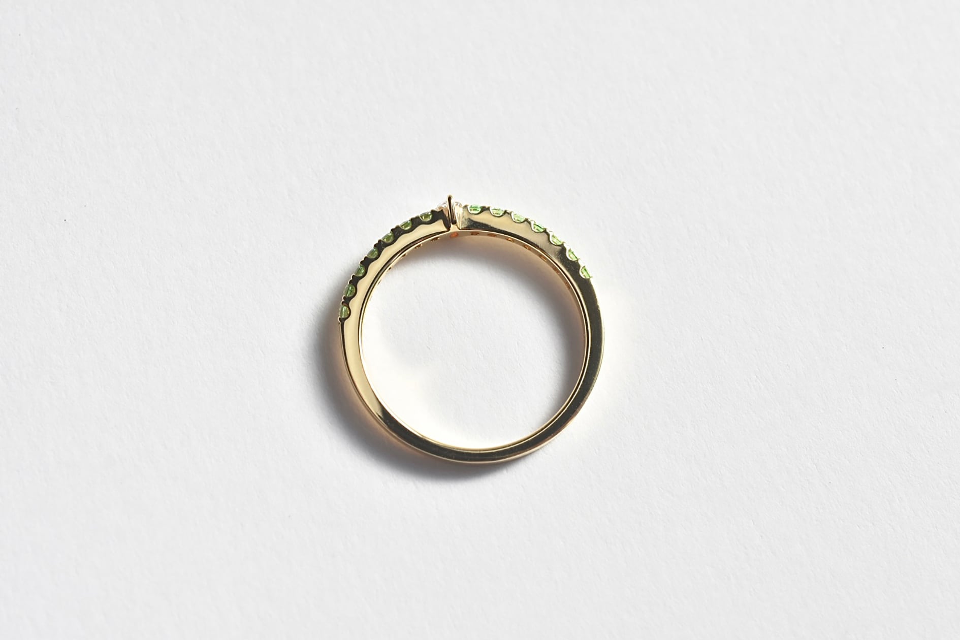 グリーングロッシュラーガーネットの中央にファンシーカットダイヤモンドをあしらったバンドリング。