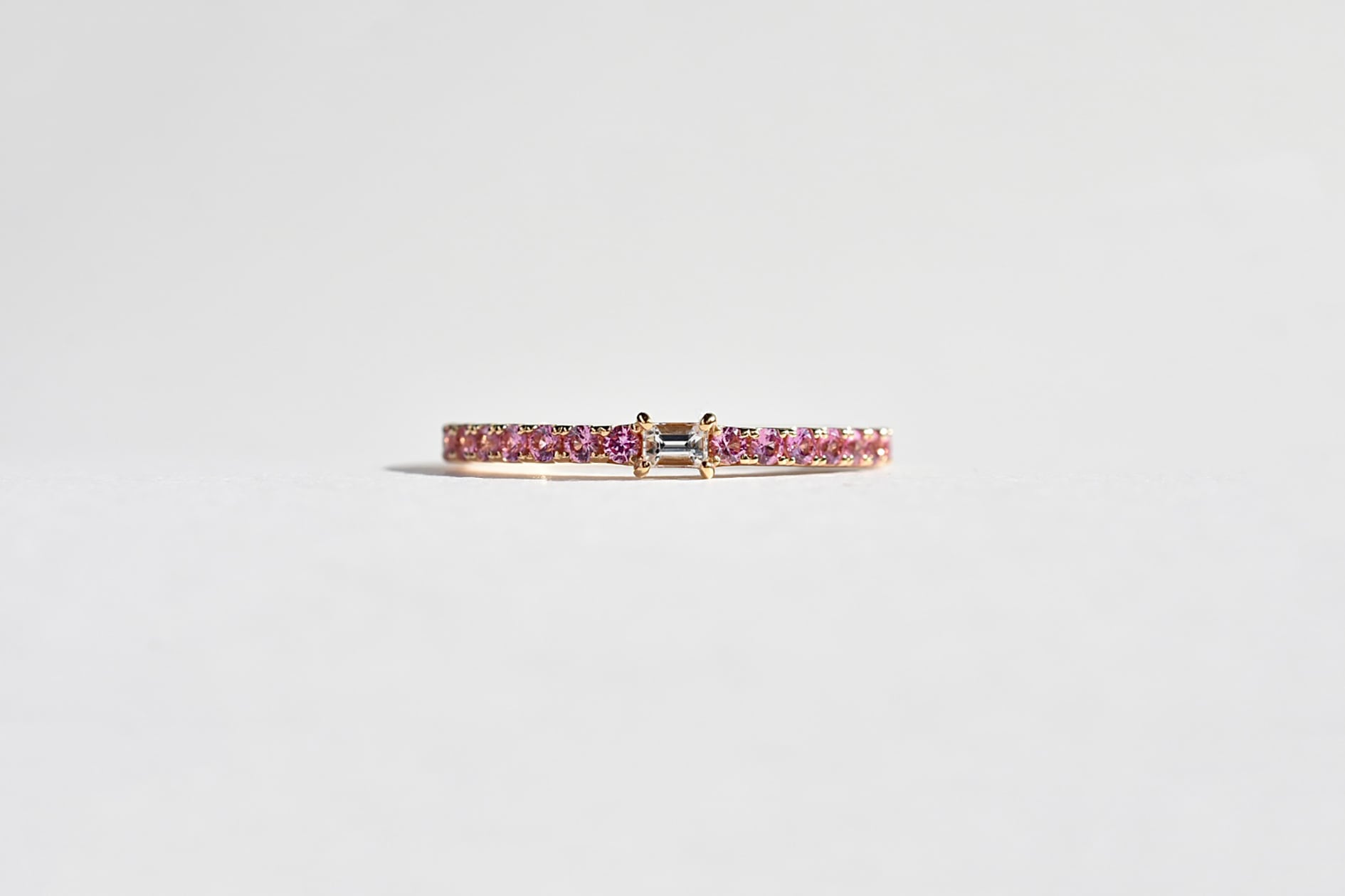 ピンクサファイアの中央にファンシーカットダイヤモンドをあしらったバンドリング。
